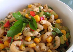 Gemüse und den noch warmen Teigwaren vermischen. Olivenöl, Zitronensaft und die gehakte